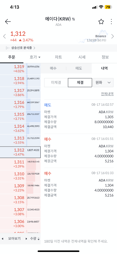 하단 메뉴 중 첫번째 거래소에서 원하는 상품을 선택하면 되는데, 저는 1300원짜리 4개 (5200원) 매수 후 매도했습니다. 매수를 누르면 바로 매수되는게 아니라 주문이 들어가고 매수가 채결되는 과정입니다. 저는 매수된 줄 모르고 한 번 더 눌렀더니 두 번 매수가 됐어요. (내역에서 확인됩니다.) 깜짝 놀라서 얼른 현재가로 전부 매도 눌러서 매도까지 완료했습니다.