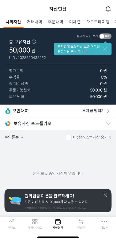 코드 입력 후 하단 메뉴 자산현황을 들어가니 50,000원 지급된 게 확인됩니다.
