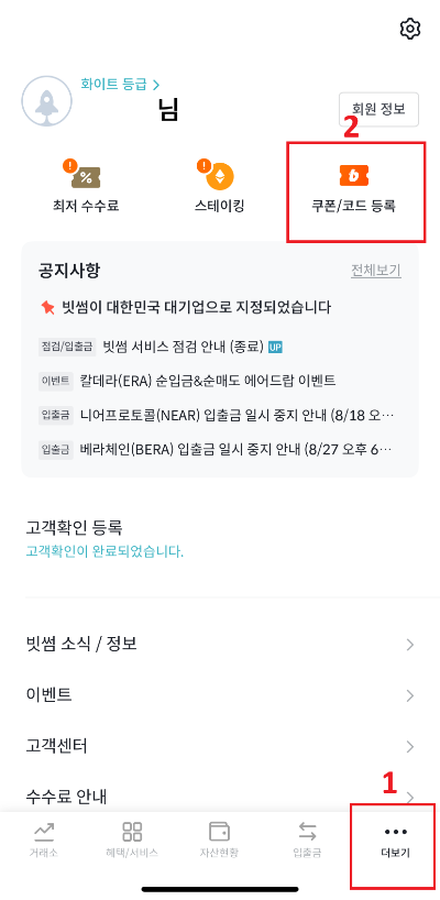 2. 아래 화면 표시해둔 더보기 -> 쿠폰/코드 등록을 누른 후 친구코드 등록하기를 눌러 초대코드 [BUJA1000]를 입력합니다.