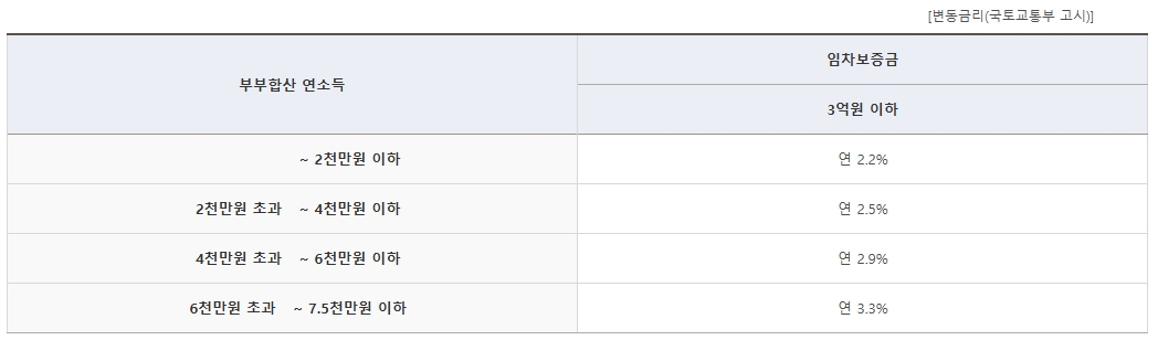 - 부부합산 연소득 5,000만원 이하 (신혼가구 7,500만원, 다자녀가구 6,000만원까지 완화됨)